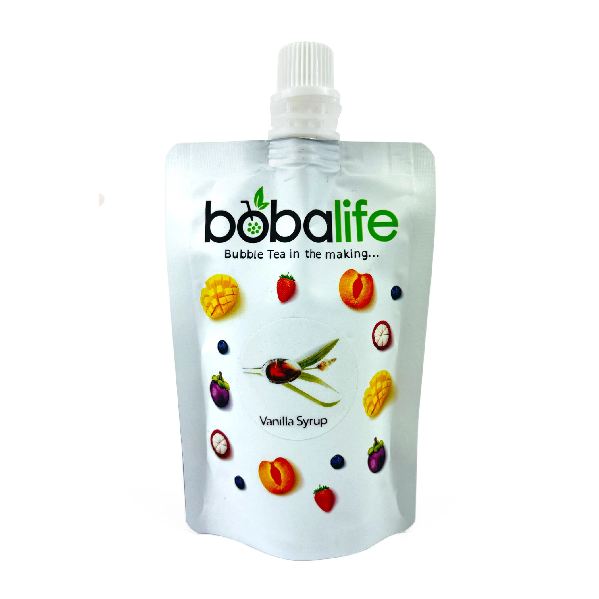 Boba Life premium Taiwanese french vanilla flavoured bubble tea syrup by Boba Life in small 150g packet. Use this french vanilla syrup mix to create a bubble tea and add bursting bubbles or traditional chewy boba balls. Just mix the syrup with your choice of cold tea, add the boba, ice and serve with a jumbo straw. Can also be used to add colour and flavour to bubble tea milk drinks.