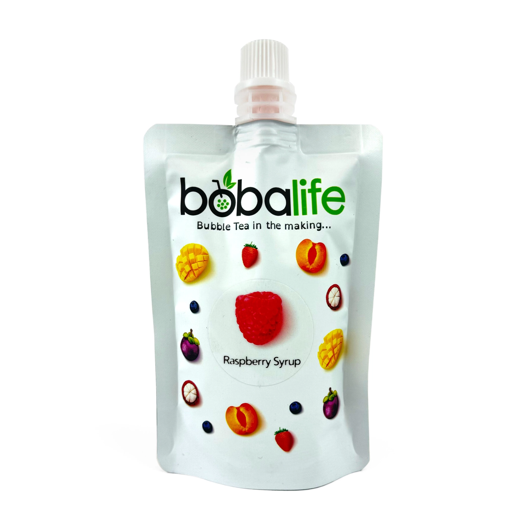 Boba Life premium Taiwanese raspberry flavoured bubble tea syrup by Boba Life in small 150g packet. Use this raspberry syrup mix to create a fruit bubble tea and add bursting bubbles or traditional chewy boba balls. Just mix the syrup with your choice of cold tea, add the boba, ice and serve with a jumbo straw. Can also be used to add colour and flavour to bubble tea milk drinks.