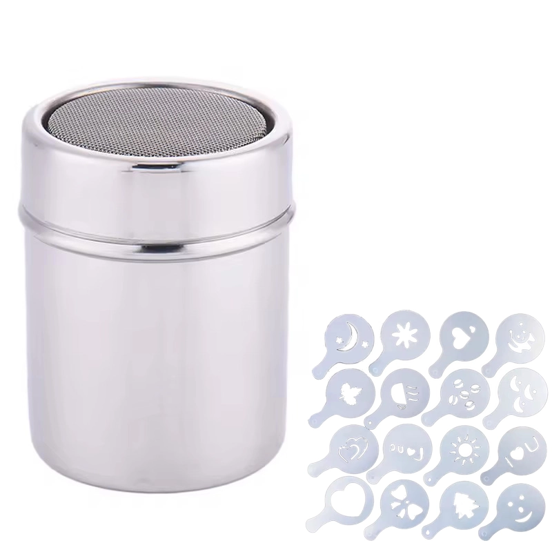 Small stainless steel cocoa shaker with threaded mesh lid and 16 coffee art stencils. Perfect for shaking cocoa, sugar or flour over drinks or dishes, it makes it easy to decorate and put the finishing touches to your cake creations or frothy coffees. Easy to use and store when not needed. This device also comes in handy for baking if you need to re-flour your counter top or dough. Easy to clean and dishwasher safe.